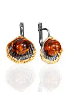 Необычные яркие серьги из серебра с чернением и золочением и натурального янтаря коньячного цвета «Ракушка»: 010108221
