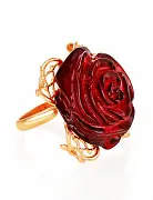 Роскошное коктейльное кольцо в виде объёмной розы вручную создано из натурального балтийского янтаря ярко-красного цвета. Яркое и женственное украшение предназначено для того, чтобы вы могли создать безукоризненный вечерний образ.