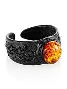 Гибкое разъемное кольцо изготовлено из натуральной кожи со вставкой из цельного натурального янтаря вишнёвого цвета с яркими зелёными искрами. Стильное и яркое, это украшение дополнит любой ваш образ эффектной ноткой. Оно идеально подходит к браслетам этого дизайна.