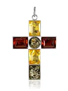 Яркий нательный крестик из натурального янтаря разных оттенков в серебряной оправе: 509219009