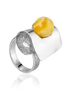 Арт-кольцо из серебра с молочным янтарём: волнообразная пластина с контрастом зеркальной и фактурной поверхностей, и глянцевым янтарным шариком. Заметное, фотогеничное, создано для тех, кто предпочитает громким репликам эффект многозначительной паузы.